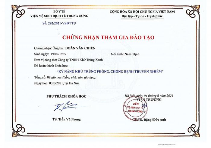 Call NowGreen Disinfection Company (GFC) is one of the leading companies providing disinfection, sterilization, and Covid-19 eradication services in Ho Chi Minh City, Hanoi, and all 63 provinces and cities in Vietnam. GFC is among the few companies certified by the Ministry of Health for 'Disease Prevention Spray' skills in epidemic prevention. With over 10 years of experience in spraying disinfectants, sterilizing, and sanitizing with Cloramin B, Nano Silver… the team is regularly trained by the Central Institute of Parasitology (under the Ministry of Health), ensuring customers a safe, sterile environment without disease germs.