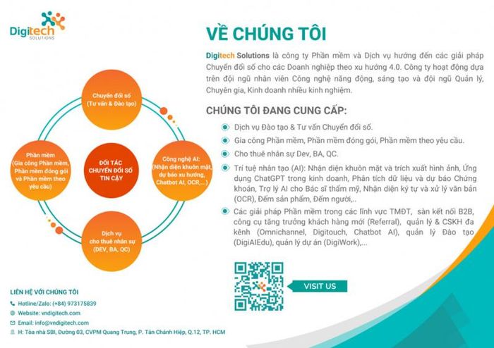 Call NowDigitech Solutions focuses on Digital Transformation solutions for businesses aligning with the 4.0 trend. With a dynamic tech team and experienced management, they offer AI solutions like facial recognition, ChatGPT application in business, data analytics, AI assistants for cosmetic surgery, OCR, product and people counting, and more. Besides, they provide Digital Transformation consultancy, software development, and solutions in e-commerce, B2B connection platforms, customer growth tools (Referral), multi-channel customer service (Omnichannel, Digitouch, Chatbot AI), training management (DigiAIEdu), and project management (DigiWork). Digitech prioritizes customer-centric values to deliver high-quality products and reliable solutions.
