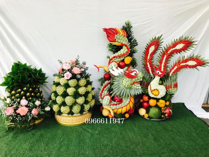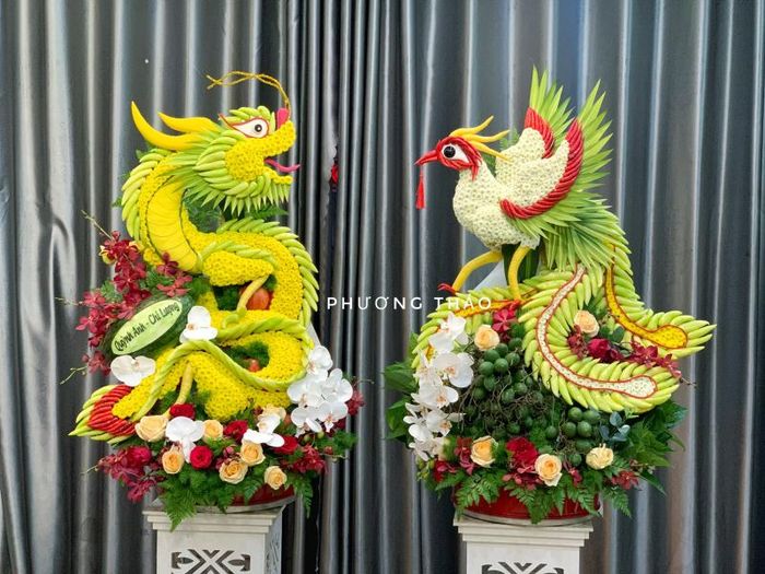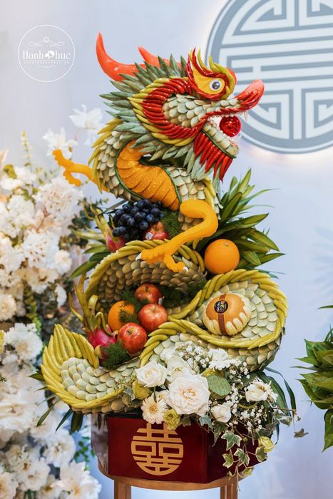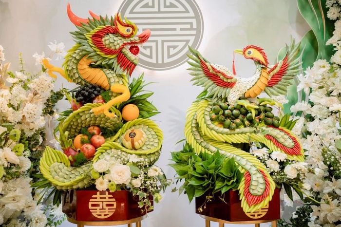 Dragons and phoenixes, symbols of nobility and grace, are integral parts of Vietnamese culture. The combination of dragon and phoenix represents the perfect harmony of a couple, bringing luck, prosperity, and social status. Understanding this cultural significance, Blissful Moments Studio offers a variety of beautifully crafted dragon and phoenix fruit trays to add grandeur to your wedding day.