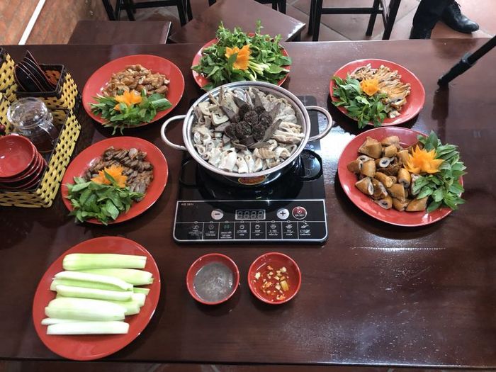The restaurant's chefs skillfully prepare the special dish of steamed wild boar, preserving the meat’s natural sweetness and aroma. The tender, juicy meat and crispy skin, without being tough, are complemented by a dipping sauce made from shrimp paste. This simple yet delightful dish captures the essence of traditional flavors and the beauty of Vietnamese cuisine. Mường Bi Bạch Hồng restaurant is celebrated for its clean, farm-to-table approach, with carefully raised meats and locally sourced vegetables.