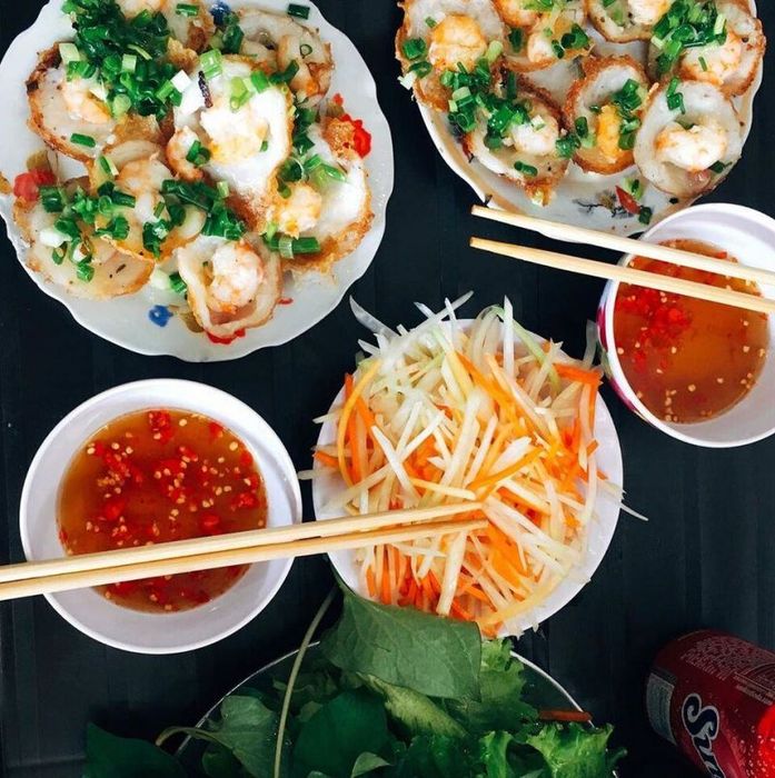 If you're visiting Huế and suddenly crave bánh khọt, you can't miss Bánh Khọt Miền Tây Kiều Thảo located on Trần Huy Liệu Street. This well-known eatery is a favorite among both tourists and locals. The bánh khọt here is perfectly sized, with a golden, crispy shell and a generous filling of shrimp and pork. Topped with a rich, savory onion oil, each bite is a delightful experience. It’s typically served with fresh lettuce, mustard greens, and a tangy, sweet chili garlic dipping sauce.