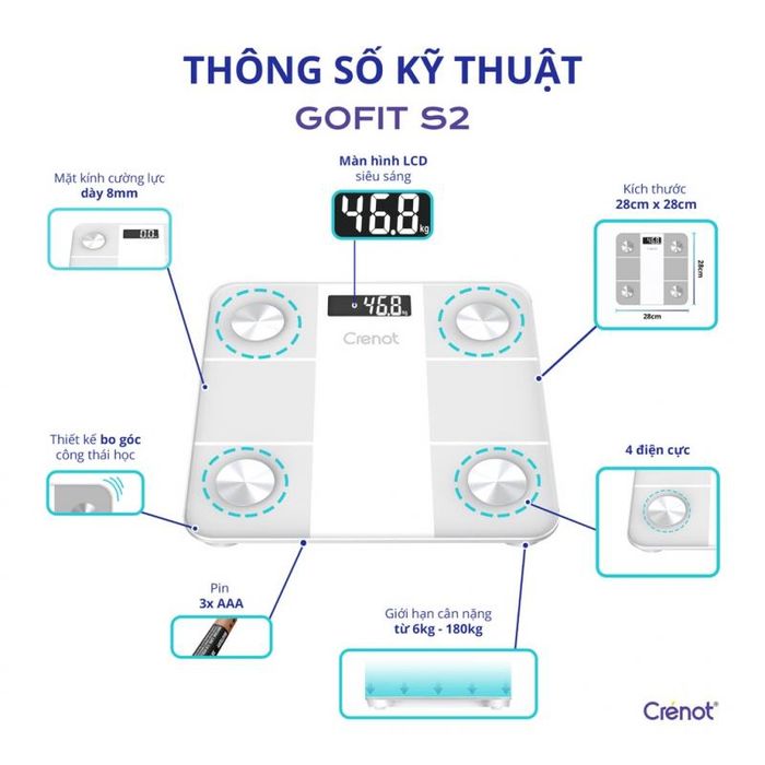 Smart Electronic Health Scale Crenot Gofit S2 connects via Bluetooth to the mobile app, analyzing 15 body indices, currently the best-selling on online platforms in Vietnam.
