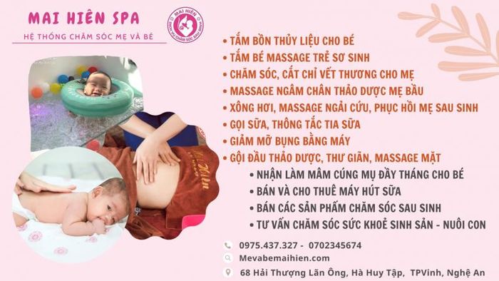 Mommy SpaMai Hiên Spa is a leading provider of prenatal and postpartum home care services in Vinh City. The spa's treatments and services are managed by top specialists and renowned doctors from Vinh. The nursing staff, trained in official medical fields such as nursing and midwifery, offers not only safe care for mothers and babies but also expert medical advice on postpartum and maternity care.