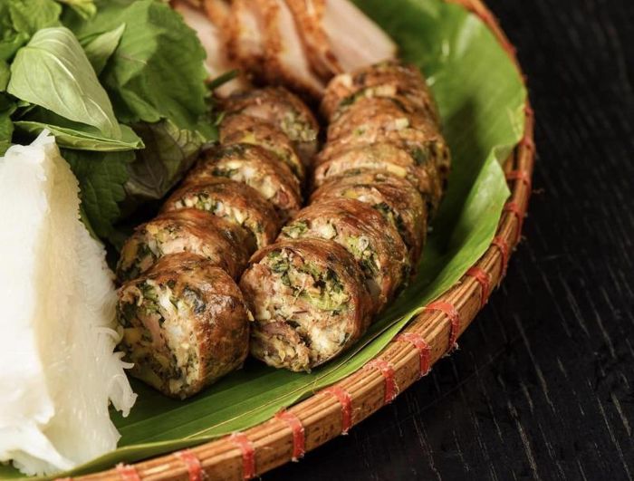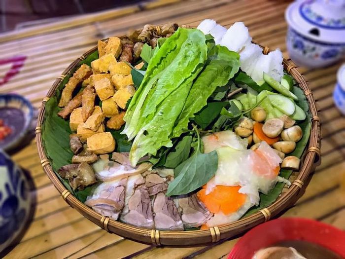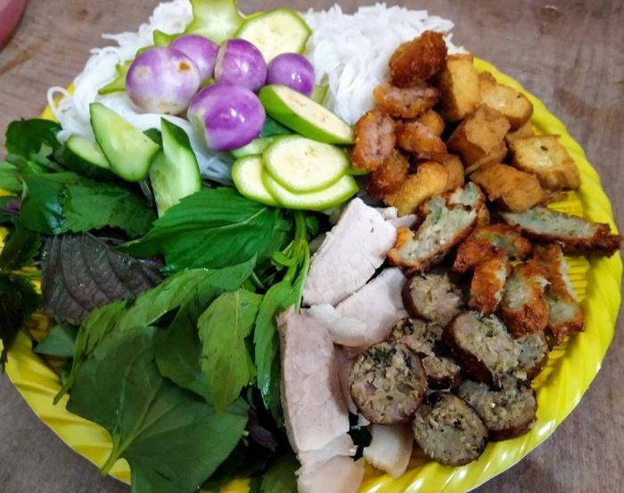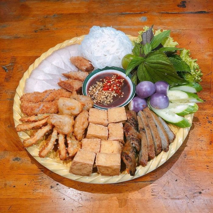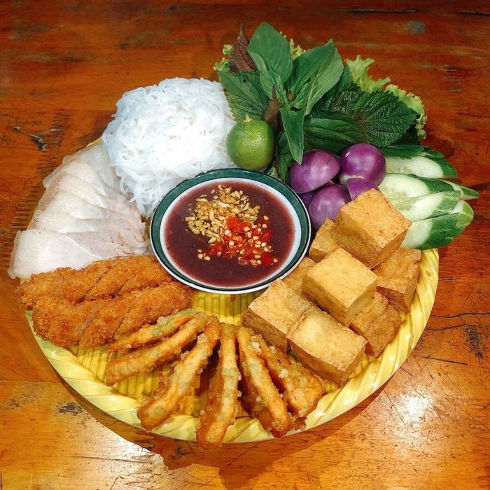 The menu at Bún Đậu A Lý is varied, offering different options of bún đậu with tasty sides like fried spring rolls, pork rolls, and sausages. The most popular choice is the full platter, which includes fresh herbs, cucumber, crispy fried tofu, grilled sausage, nem (spring rolls), chả cốm, pork leg, and jellied pork. The shrimp paste here stands out for its perfect balance of flavor – not too salty or pungent, but rich in aroma, which gives the dish its signature taste. Every bite of this freshly prepared bún đậu will leave you satisfied, with each ingredient cooked to perfection.