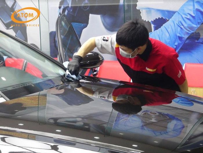 The Ceramic coating service at Hào Quang Auto includes scratch removal, polishing, and full coverage for your car's paint, windows, black plastic parts, rubber, rims, and tires. This helps create a glass-like shine on the surface, offering a lotus-leaf effect that prevents water and dirt buildup, making cleaning easier. It also protects the paint from fading and extends the lifespan of the coating, while guarding against harmful UV rays.