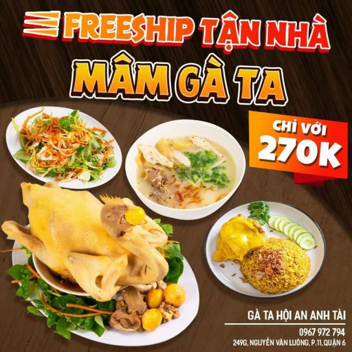 Gà Ta Hội An Anh Tài offers authentic chicken dishes with crispy skin and tender, flavorful meat. Diners who visit are sure to return as the restaurant consistently delivers satisfying meals. The dishes here, particularly the chicken porridge, stand out for their rich and savory taste—unique features you won’t easily find elsewhere.