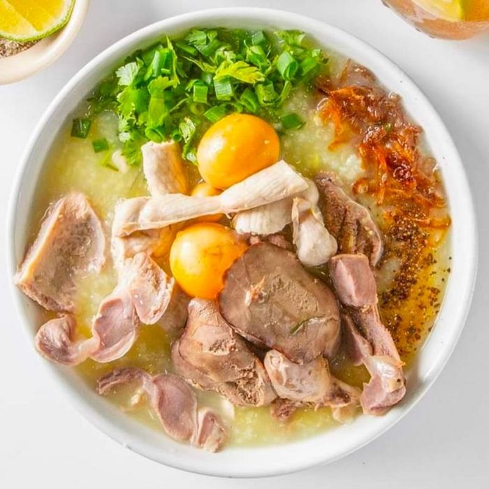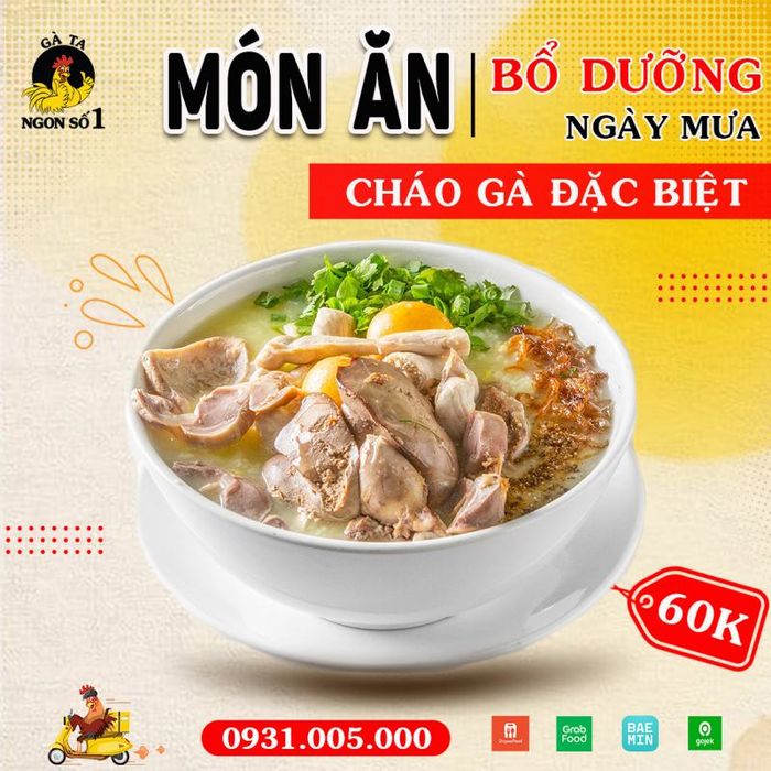 At Gà Ta Ngon Số 1, the aim is to provide healthy meals that nourish the body. Each dish is made with fresh ingredients, offering balanced nutrition and great taste. On rainy, chilly days, their hot chicken porridge, made with flavorful chicken broth, is a perfect choice. The porridge is made with shredded free-range chicken and also includes chicken offals and soft golden eggs. The dish is aromatic, topped generously, and the soft, creamy eggs perfectly complement the crispy, tender chicken offals—an ideal comfort meal for rainy days.