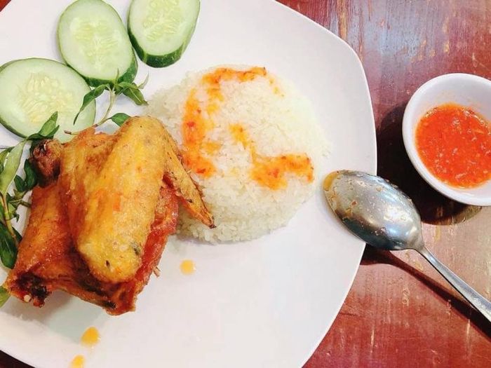 Hoàng Diệu Chicken Rice is another popular spot that Mytour recommends for those craving crispy fried chicken with rice. This restaurant is well-known in Da Lat for its delicious fried chicken rice and garlic-chili rice. The chicken is fried until crispy, paired with a flavorful soy sauce mixed with chili, served alongside pan-fried rice, cucumbers, and tomatoes. What makes the rice at Hoàng Diệu Chicken Rice special is that it's stir-fried with mashed tomatoes, giving it a vibrant red color. However, prices here are slightly higher compared to other places.