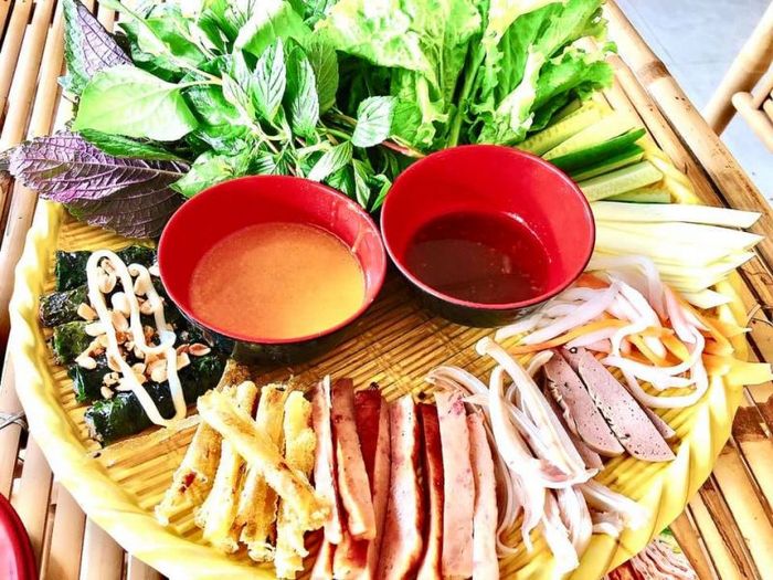 Alongside the mentioned addresses, Bún Cá Nem Nướng Nha Trang - Street 79 is also an ideal spot for those who love fragrant grilled sausage in Ho Chi Minh City. The rolled nem is paired with fried rice paper, mango, fresh vegetables, and dipped in a special soy sauce. Those who have tried the grilled sausage here praise its firm and flavorful meat, not greasy, with a natural sweetness from quality ingredients and recipe. The crispy and tender texture of the pork skin, the sweet and sour taste, along with the slightly spicy dipping sauce and the subtle aroma of rice paper will delight the diners.