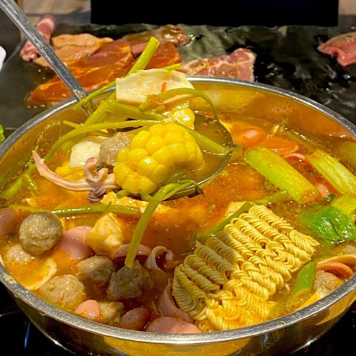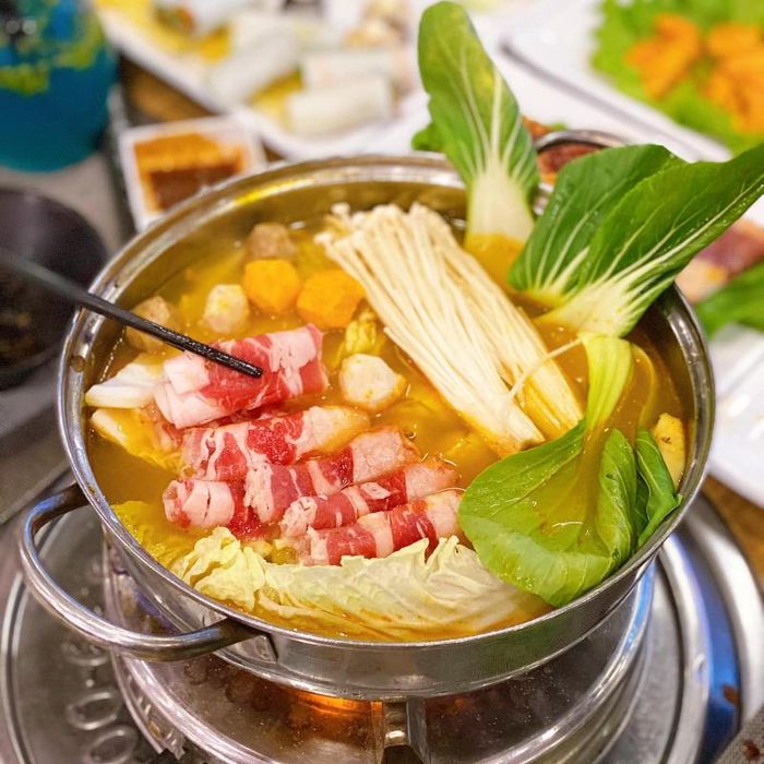 Just looking at the food will make you want to try it all. The hotpot is served piping hot, with a fragrant broth that's tangy and spicy, bringing a Korean-style flavor to your dining experience. The menu is extensive, offering a wide variety of options for diners to choose from. Additionally, the distinct aroma of grilled meats and seafood sizzling on the grill attracts many visitors. Pork belly, beef, and seafood sizzling on the grill create the perfect atmosphere for friends to catch up. The hot and sour hotpot, brimming with seafood and fresh vegetables, will keep you dipping and enjoying for hours. The spacious setting at Nhà Ngân Buffet Hotpot & Grilled makes it an ideal place for group gatherings.
