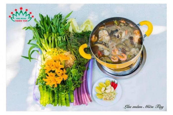 The broth of the mắm hotpot itself is deeply aromatic, with the pungent scent of fermented fish blending perfectly with the richness of the bone broth, creating a truly mouthwatering experience. The hotpot is served with a variety of seafood and local vegetables, such as water lily and wild-vegetable flowers. In addition to the famous mắm hotpot, Thiên Tân Restaurant also offers a range of other delicious hotpot options, such as Thai hotpot, mushroom hotpot, and seafood hotpot, ensuring a delightful feast for all. Thiên Tân is a reputable and high-quality restaurant that should be on your list when you visit Vinh Long.