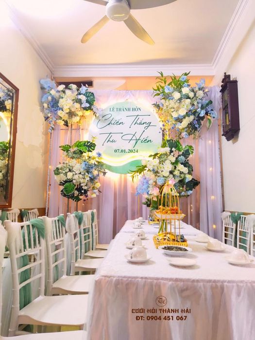 Thanh Hai offers a wide range of services, including decorating banquet halls at restaurants or homes, outdoor wedding setups, wedding table arrangements, ceremonial offerings, and more. You can choose between full-service decoration packages or individual services based on your budget and wedding plan. With many years of experience, Thanh Hai confidently delivers everything from luxurious, classic styles to custom themes tailored to the couple's wishes.