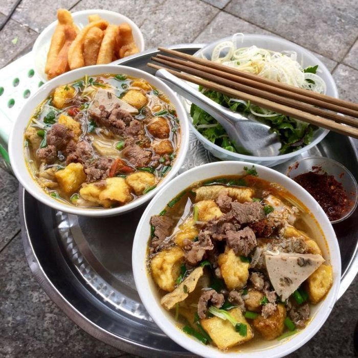 The bowls at Loan Bún Riêu Cua Đồng are quite large, with noodles at the bottom, topped with crispy fried tofu, ripe red tomatoes, a rich broth, and a layer of crab paste. The broth is the highlight – light yet flavorful with a subtle richness and a sweet hint of crab. Those who aren’t used to a lot of spices might find it a bit spicy and salty, but the owner thoughtfully provides fresh herbs and crispy dough sticks to add to the soup for extra flavor and fullness. You can also order extra tender beef and chewy fish cakes. The bowl comes with a generous portion of fresh herbs, coriander, dough sticks, and iced tea. A reasonably priced spot with great atmosphere and quality that’s definitely worth a visit.