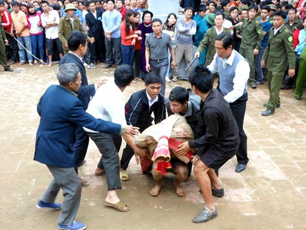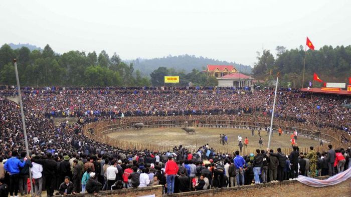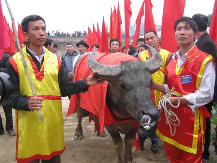 This is considered one of the oldest buffalo fighting festivals in Vietnam, with two distinct parts: the village Patron Saint worship ceremony and the spectacular buffalo fighting festival. The unique cultural feature of Hai Luu Buffalo Fighting Festival is that the 'buffalo champions' are collectively raised and trained by groups. Experienced villagers directly select the buffaloes, which have a special diet and daily training in martial arts techniques for competition and increased agility. The buffalo fights always occur head-on using horns and strength to determine the attacking position, and regardless of victory or defeat, the buffaloes never attack each other from behind or the sides, showcasing the martial spirit of the people. After nearly half a year of care and training, the buffaloes are brought into battle. When a buffalo wins, it is slaughtered as a 'sacrifice' like in the time of Lu Gia, and visitors can buy the meat as a lucky gift. If you have the opportunity to travel to Vinh Phuc during the festival season, be sure to visit Hai Luu commune to immerse yourself in the lively atmosphere of this buffalo fighting festival. As you leave, remember to say: