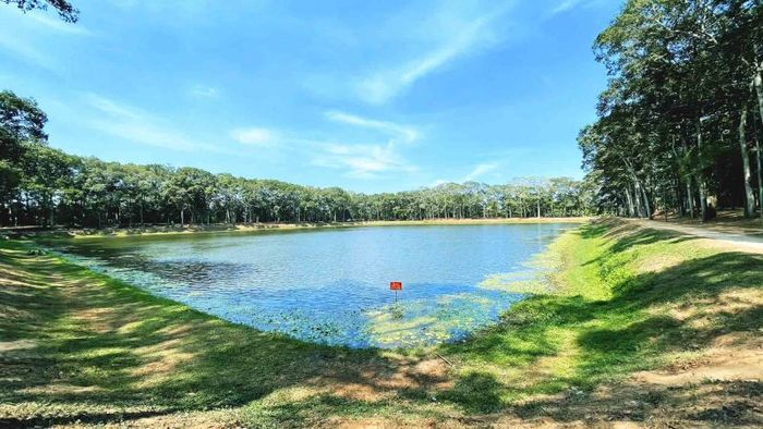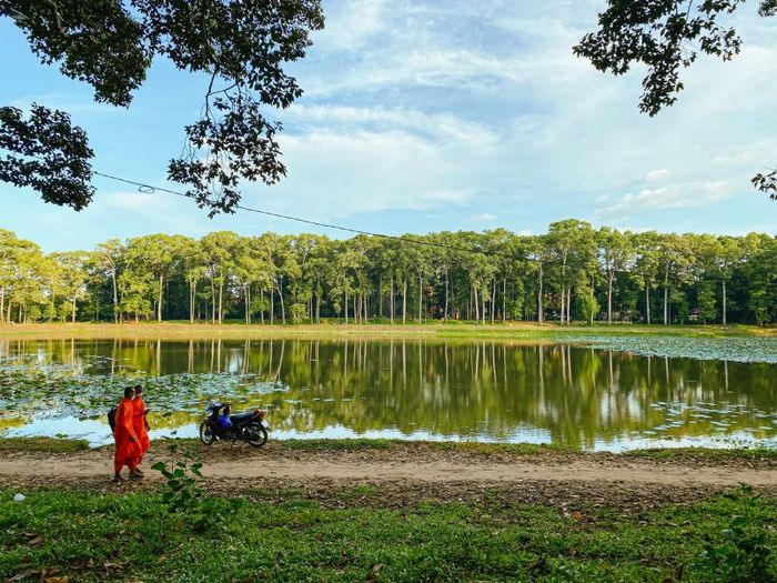 This serene, clear pond stretches about 500 meters long and 300 meters wide, also known as Square Pond. The pond is surrounded by hundreds of ancient trees, most notably starfruit and oil trees that are centuries old, with massive roots rising above the ground, forming unique shapes. Some of these roots are large enough to create small caves for children to play in, and others have grown into natural benches where visitors can relax and enjoy the surroundings.