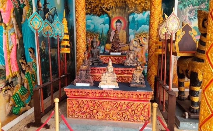 The Khmer Culture Museum is located within the national heritage site of Ang Pagoda and Ba Om Pond. It is one of only two Khmer culture museums in Vietnam, the other being in Soc Trang. The entire upper floor of the Khmer Ethnic Culture Museum in Tra Vinh is divided into four rooms, each dedicated to different aspects of Khmer culture, including spiritual culture (featuring images of the 143 Khmer pagodas in Tra Vinh and stone sculptures related to the spiritual life of the Khmer people), material culture (with artifacts and tools used in daily life and production), and traditional crafts of the Khmer community (such as mat weaving, sculpture, basket weaving, and making rice cakes).