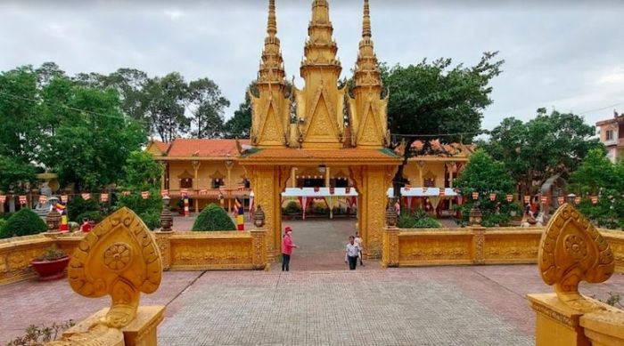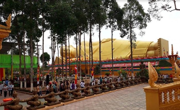 From the outside, the grandeur of this pagoda is overwhelming, resembling a majestic golden palace. The shimmering golden hues emanate from every part of the pagoda, from the arched roof, walls, and supporting columns to the intricate carvings and statues. Visitors are left in awe of the sheer magnificence and opulence of Vam Ray Pagoda, which is steeped in Khmer culture. The golden decor and meticulously crafted patterns create a dazzling spectacle. Another striking feature is the 54-meter-long reclining Buddha statue, which leaves a lasting impression on all who visit.
