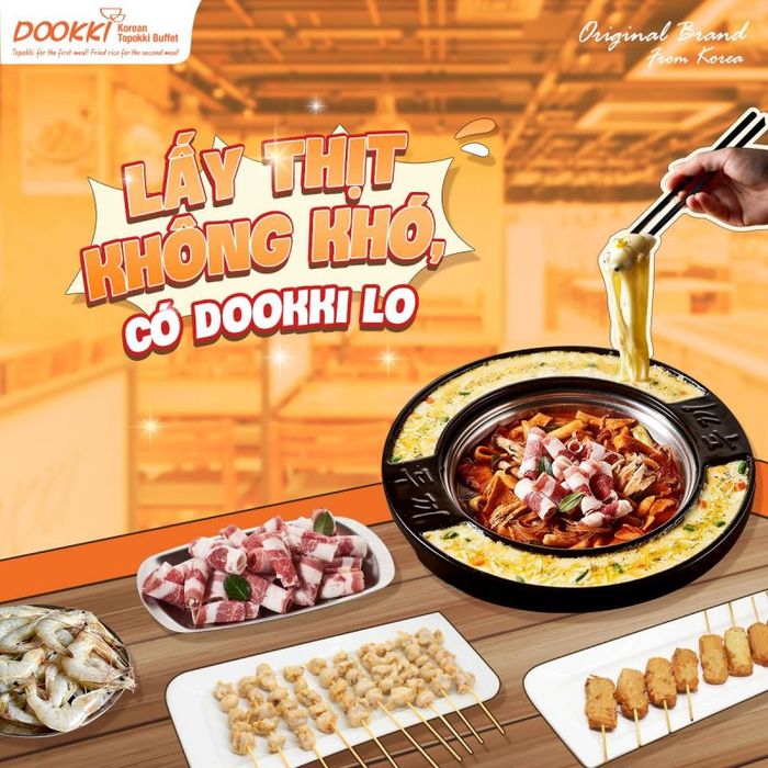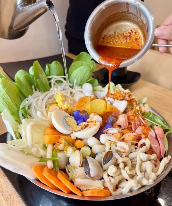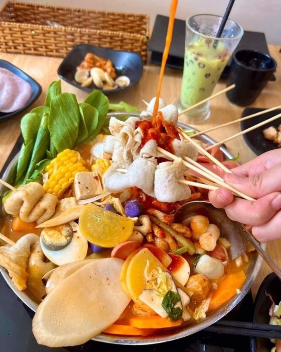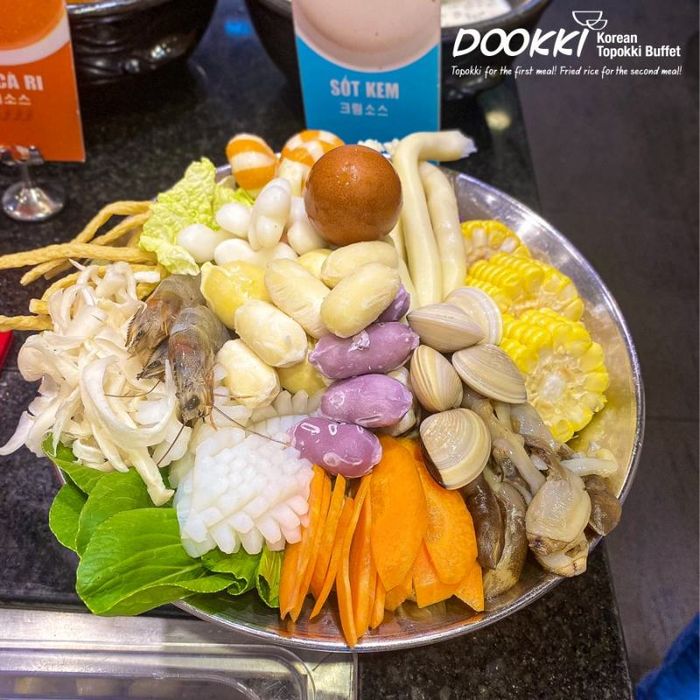 Dookki Vietnam specializes in authentic Korean tokbokki hotpot buffet, priced at 139,000 VND per person (excluding VAT) for 90 minutes of unlimited eating. At Dookki, you can enjoy a wide variety of tokbokki and toppings like pork belly, different types of vegetables, carrots, sweet corn, enoki mushrooms, fish cakes, eggs, beef balls, noodles, and more. Once you've selected your favorite toppings, you head to the sauce station where you can craft the perfect sauce to elevate your meal.