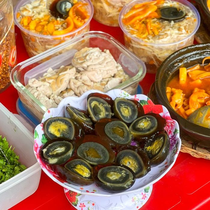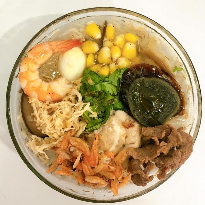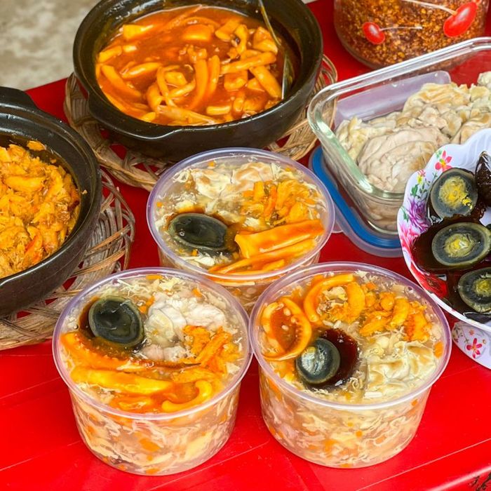 A full bowl of crab soup at Súp Cua 79 includes vegetables, mushrooms, eggs, chicken, meatballs, shrimp, and crab, with the portion size varying slightly with each serving. You can also customize your soup by adding extra toppings like Thai-style squid, pig brain, or preserved duck eggs, with an additional charge for each topping. Most customers take their soup to go, as it's conveniently packaged in plastic containers for easy transport. The hot, fragrant soup is ready to enjoy right away. Why wait? Head to Súp Cua 79 for a revitalizing bowl of crab soup to start your day on the right note!