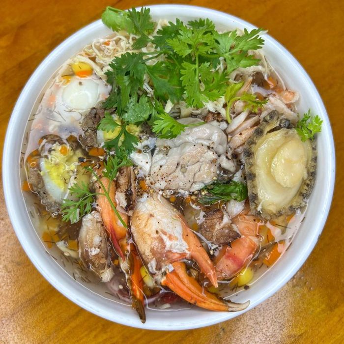 For the ultimate seafood soup experience in Can Tho, Mytour recommends Súp Tài Cần Thơ - Súp Cua Bào Ngư Vi Cá và Cháo Sò Huyết. The menu features a variety of soups such as traditional crab soup, oyster soup, pig brain soup, beef soup, shrimp soup, seafood crab soup, abalone crab soup, special crab soup, and premium crab soup. While the seafood crab soup isn't the most affordable, the premium toppings make it a favorite among customers who keep coming back for more. The soup includes large crab claws and a variety of other premium ingredients.