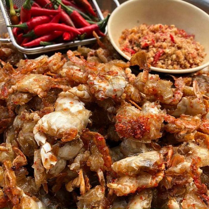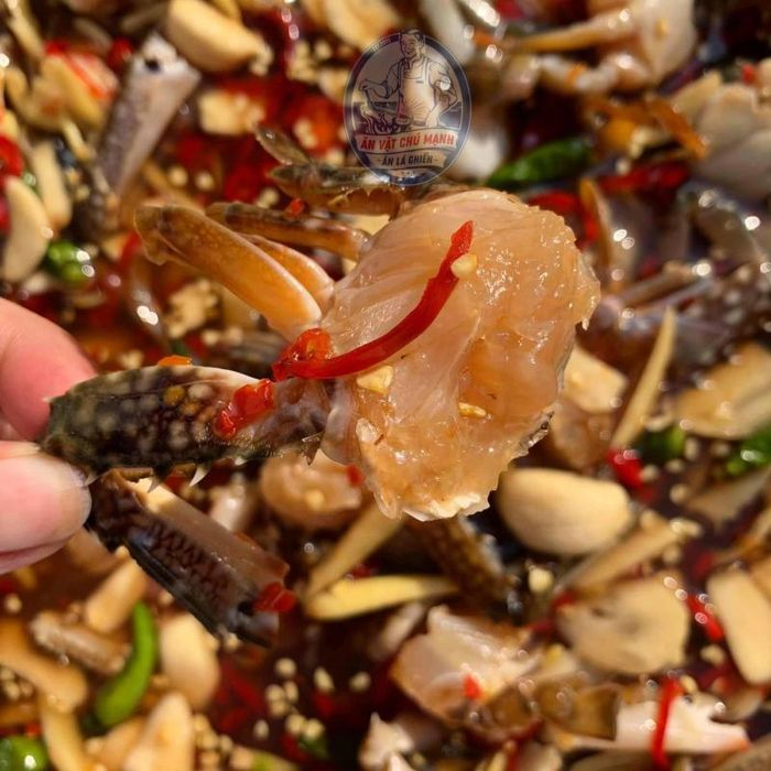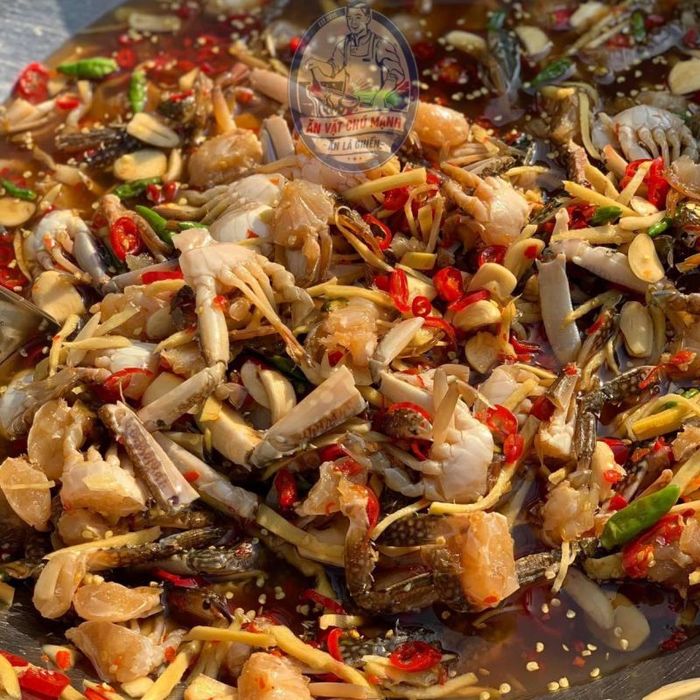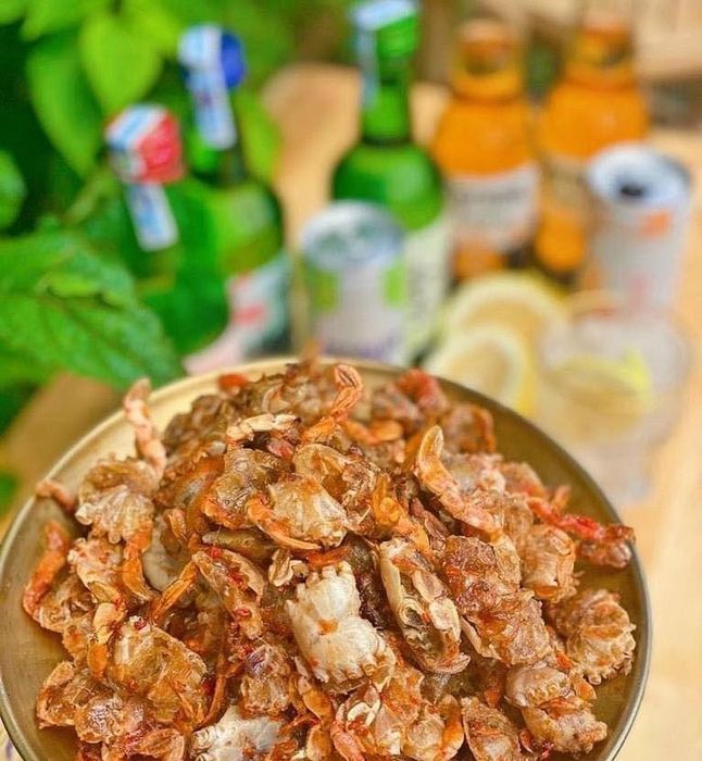 Chú Mạnh's Snack, crabs are stir-fried with tamarind or salted and cooked directly on a hot pan, ready in no time as they are cleaned and partially boiled beforehand. If you like something spicy and salty, try the salted crabs or the crab legs with chili salt. The beef tendons are tender, slightly spicy, and make a perfect appetizer. Also, try the crispy rice mixed with salted egg, topped with shredded chicken and lime leaves for a fantastic crunchy snack.