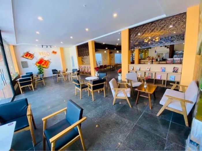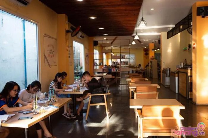 MÙA HÈ Cakes and Drinks is one of the top cafes in Da Nang where students often go to study. The café features a spacious and comfortable atmosphere with modern and visually appealing design. The use of warm yellow lights and natural lighting creates a cozy environment while being gentle on the eyes. With two large floors, comfortable seating, air conditioning, and fast Wi-Fi, MÙA HÈ is the perfect spot for focused study sessions. The ambiance is ideal for individual study, group discussions, or simply enjoying a coffee while observing the bustling city streets. Affordable prices, friendly service, and a central location make it a popular hangout, especially during exam seasons. It's the go-to place for many students to 'eat, sleep, and study.'