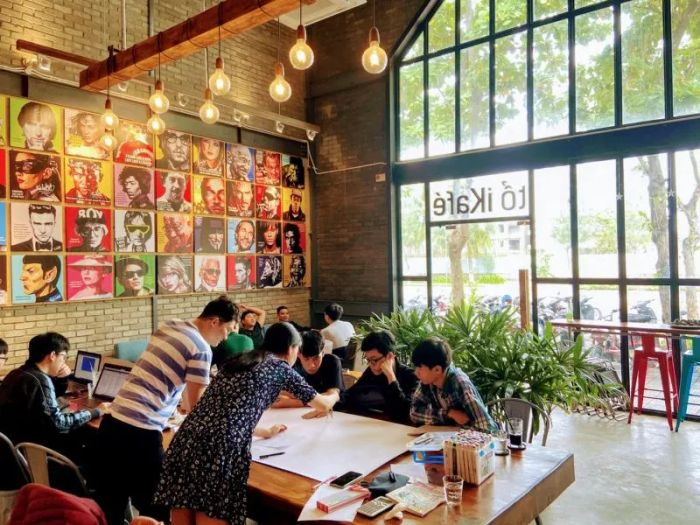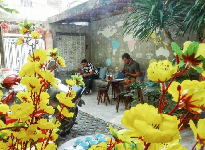 Located in a prime spot along the bustling riverside, Cộng Caphe has long been a favorite hangout for Da Nang's youth. The café takes inspiration from the post-war era, with a color scheme dominated by military green, evoking a sense of nostalgia for the past while blending with the modern energy of today. The café's décor features iconic items such as old-fashioned hats, red TVs, and vintage fans, all adding to the nostalgic atmosphere. The walls are adorned with classic poems and songs that many will find familiar. With its retro and peaceful ambiance, this café is perfect for those looking to enjoy a cup of coffee while studying or reading a book.