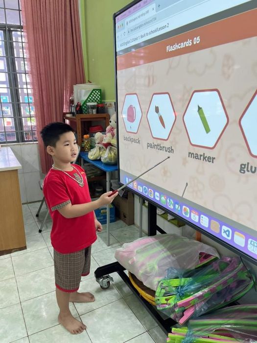 International Language Center Hello World utilizes the English Kiddies electronic curriculum taught entirely on computer systems. Especially, computers with 32-inch screens display clear images and clear sound, vividly demonstrating the gestures, expressions, accents, and proper pronunciation of native speakers. This plays an important role in creating an ideal environment for students to become familiar with the authentic accent and communication style of native speakers.