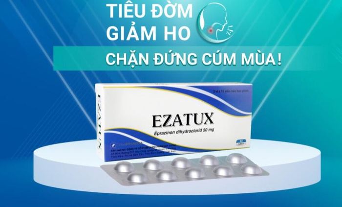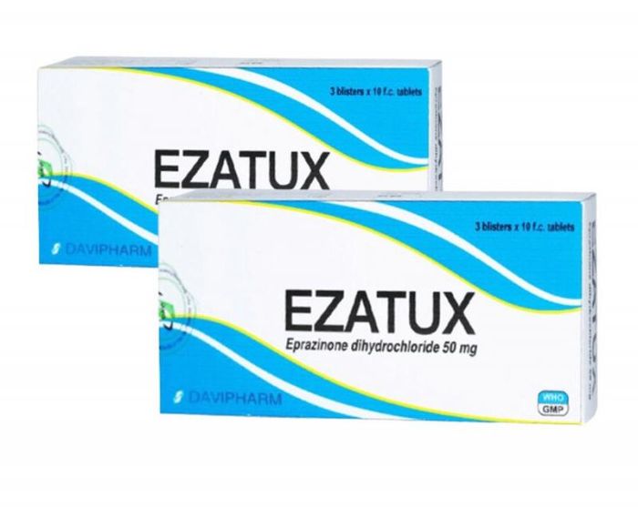 Ezatux is a group of respiratory tract acting products, containing the active ingredient Eprazinone dihydrochloride 50mg. Ezatux is manufactured by DAVIPHARM Joint Stock Company - VIETNAM with registration number VD-22320-15. Information on Eprazinone dihydrochloride component Pharmacodynamics: Eprazinone, a piperazine derivative, is a mucolytic regulating substance. Pharmacokinetics: After ingestion, peak blood concentrations are reached within 1 hour. The product is mainly metabolized in the liver (alkyl breakdown). The elimination half-life is about 6 hours. Dosage form and strength of the product Pharmaceutical form: film-coated tablets Packaging: box of 3 blisters x 10 tablets Strength: 50mg Excipients: Povidone, lactose monohydrate, crystalline cellulose, sodium starch glycolate, magnesium stearate, hydroxypropylmethylcellulose, polyethylene glycol 6000, talc, titanium dioxide, erythrosine lake color.