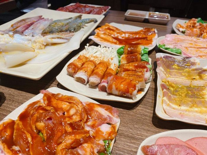 The meat is grilled on a cast-iron pan, which helps retain its natural sweetness and flavor. Many people love Hugo BBQ for its clean, convenient, and safe grilling method. The restaurant also serves fresh seafood, giving you more variety to explore. The ingredients are always fresh, carefully prepared, and marinated perfectly. With a diverse menu like this, it's a must-try for anyone visiting. One of the most popular sets includes a variety of meats such as beef, brisket, chicken legs, pork belly, and sausages. Grilled hot and served with spicy kimchi, it's a delicious combination that’s hard to resist. Be sure to keep this spot in mind for your next gathering with friends!