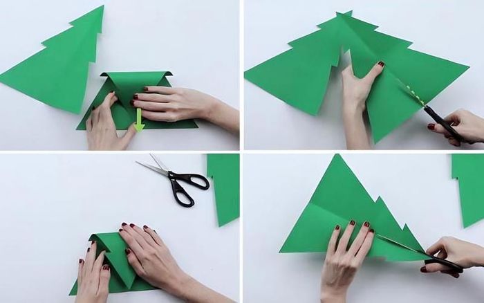 - Step 1: Cut out the tree shapes: Stack the two pieces of cardstock and fold them in half lengthwise so they align perfectly. Draw the shape of a Christmas tree on the outer side of one of the sheets and cut along the outline. When you unfold it, you’ll have two identical tree shapes.