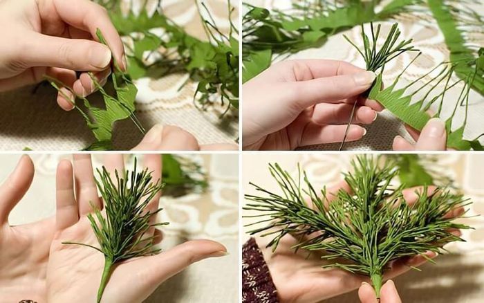 - Step 2: Create the pine needles: Twist each tissue fringe into small pine-like needles using your fingers. Repeat this step for all the paper strips.