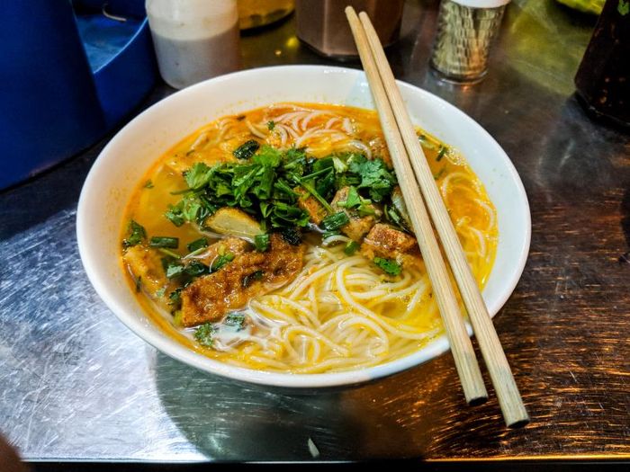 Bún Chả Cá Bà Lữ is a well-known spot for locals, students, and anyone looking for a delicious yet affordable bowl of fish cake noodles. The quality here is top-notch, with the bowl packed full of fish cakes, fresh herbs, bean sprouts, and pickled vegetables, providing a satisfying and flavorful meal. For many, starting the day with a bowl from Bún Chả Cá Bà Lữ feels like pure happiness, especially with the accompanying nutritious drink. With years of experience, this place continues to draw a steady stream of visitors eager to enjoy their signature dish.