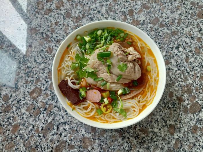 Bún Bò Huế An Cựu - The Taste of the Ancient Capital is a must-try destination for bún bò Huế in Da Nang. The broth is clear and delicate, with a perfect balance of sweetness from the bone stock. The dish isn't overly rich, making it light yet flavorful. Thanks to its secret family recipe, the broth becomes even more delicious and irresistible. The shop also prioritizes food safety, ensuring customers can enjoy their meal with peace of mind. The bowl includes beef, pork sausage, beef sausage, quail eggs, crab paste, beef blood, and pig trotters. The special version has even more toppings, making the bowl look more generous and appealing. The broth here has a pure, savory taste, without artificial seasoning. Bún Bò Huế An Cựu - The Taste of the Ancient Capital serves the dish with thick noodles, in line with traditional bún bò Huế standards. Mix the noodles with some chili paste and fresh herbs for the ultimate experience.