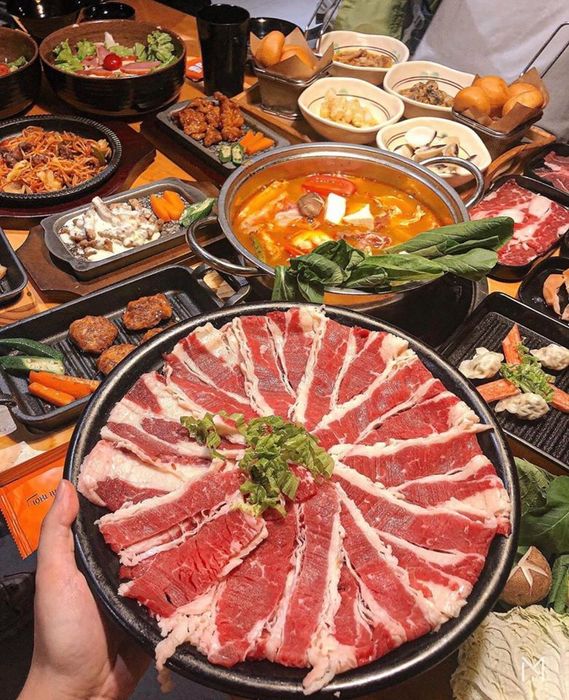 The restaurant is well-known for offering affordable combo meals for two, with options priced at 450k and 550k. Both sets include a selection of grilled meats and side dishes such as TopBlade beef, American beef ribs, French fries, and cheesy corn. The 550k set also includes grilled seafood like shrimp and octopus, offering a unique combination of meats and seafood. For meat lovers, there are plenty of à la carte options, including marinated TopBlade beef, marinated American beef ribs, Iberico pork, shrimp, octopus, pig's trotters, and Oishii beef sirloin. All the grilled items are prepared with the restaurant’s signature marinades, delivering a distinctive and unforgettable flavor.