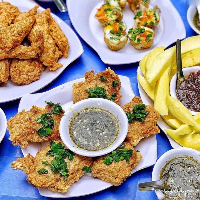If you want to savor this dish, visit Sister Bon's Snack in District 8. Besides crispy rice with fish sauce-drenched fish, the restaurant also serves various trendy dishes: beef balls in chili sauce, stir-fried corn with salted eggs, etc.