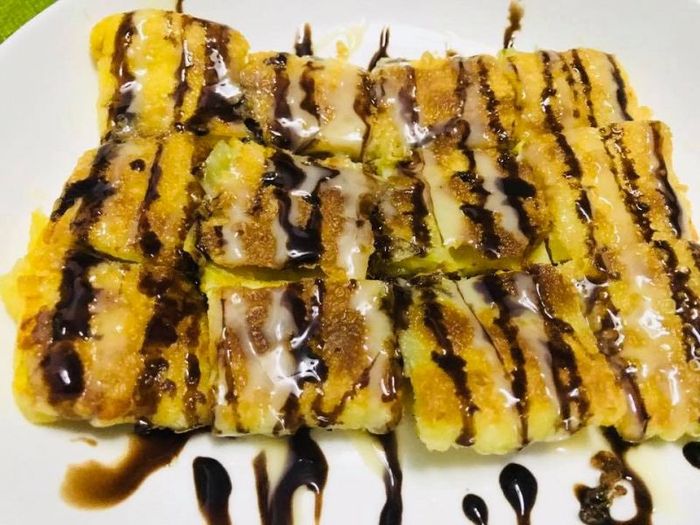 Thai-style banana cake has a thin outer layer made from thinly spread batter, fried with butter. Once the outer layer is firm, the cake is filled. The combination of banana, eggs, and mozzarella cheese delights many diners. After rolling the outer layer and filling, the cake is taken out and drizzled with chocolate sauce. The cake is mildly sweet, fragrant with the aroma of eggs, cheese, and the distinctive banana scent. The slightly bitter chocolate sauce harmonizes the overall taste.
