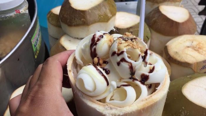 A coconut is split in half, the water is drained, and one half is used to hold the ice cream. Sellers often choose the xiem coconut variety, which fits perfectly in the palm of your hand and is easy to hold. The ice cream is made from fresh coconut water and coconut flesh, resulting in a naturally sweet and refreshing taste. The ice cream is uniquely shaped like a cute flower, not rounded like many other places, making it very appealing. If you prefer it sweeter, you can add condensed milk, chocolate sauce, or strawberry on top.