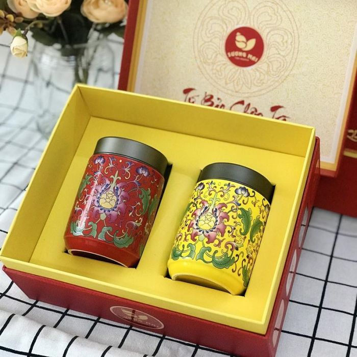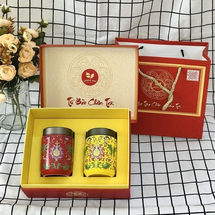- The Khai Tâm Tứ Phẩm VIP Tea Gift Box comes in a luxurious design, including: a beautifully crafted ceramic jar of tea, containing exquisite tea from the Four Treasures of Authentic Tea collection in red, green, yellow, and white colors, allowing customers to select the color that suits their feng shui preferences. It also includes a large premium box with two jars and a stylish paper bag.