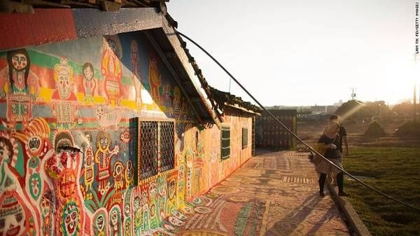 A 93-year-old man, the last resident of the village, has built houses and adorned them with numerous brightly colored wall paintings. The old village has been given a new lease of life with many murals depicting children, playful animals, and vibrant scenes.