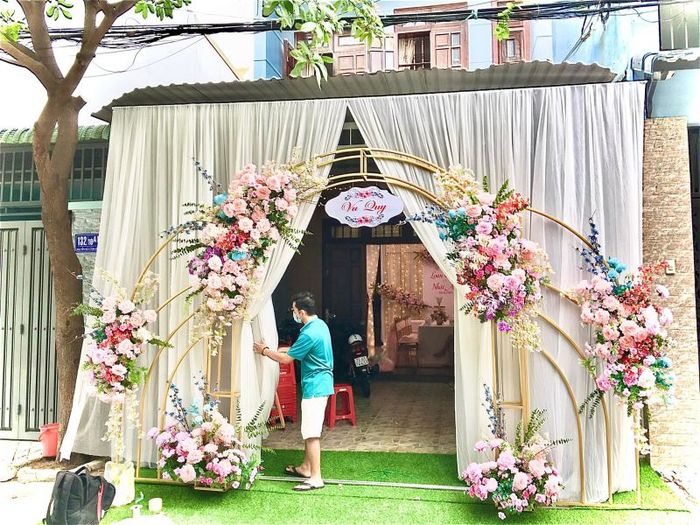 To achieve an elegant and memorable wedding, many modern brides opt for fresh flowers to adorn their venue. From bridal bouquets to reception tables, floral arrangements help set a romantic, vibrant mood. The floral arch, designed to match the couple's color theme, will complement the bride's grace and the groom's strength, making the wedding truly special. With Ngoc Tran Wedding Decor, every detail is tailored to reflect the personality of the couple.