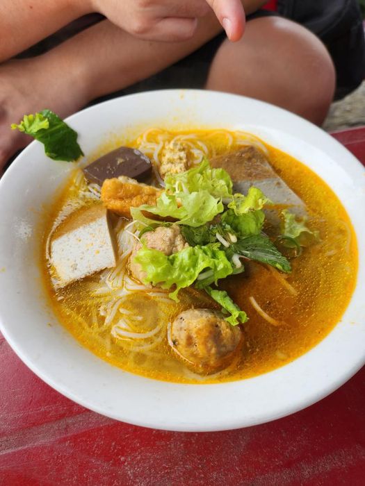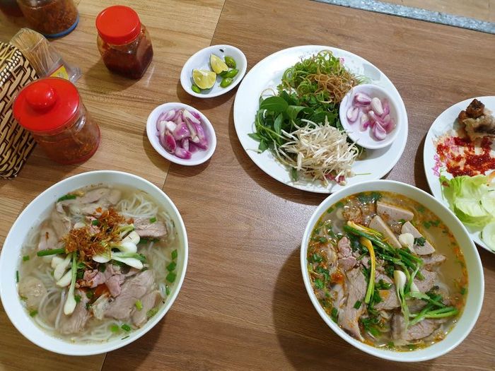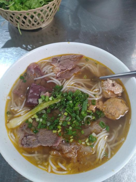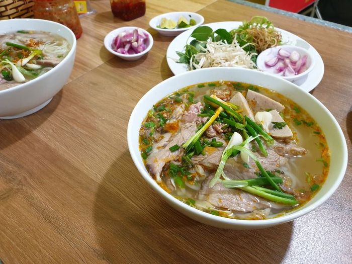 When talking about Bún Bò Huế in Hội An, one cannot ignore the famous brand – Bún Bò Huế Phạm Hồng Thá. For those who love this dish, it's a must-visit for an authentic, flavorful bowl. The Bún Bò here includes tender beef, pork sausage, beef cakes, quail eggs, crab cakes, blood pudding, and pork knuckles. The special bowl has extra toppings, making it look even more appealing. The broth is clear, free of MSG, and has a rich taste from the simmered bones.