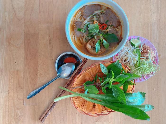The typical bowl at Bún Bò Huế Cô Dung includes pork knuckle, beef shank, rare beef, sausage, crab cake, and blood pudding. The meats are generously portioned, tender, and easy to eat. What stands out most here is the broth. To achieve its natural sweetness, the owner meticulously simmers pig's head bones. The broth is clear and light, offering a refreshing taste. A side of fresh herbs, perilla, banana flower, and other greens complement the dish perfectly, catering to southern tastes. Additionally, the attentive service is another highlight of this establishment.