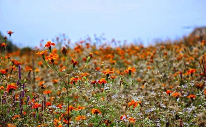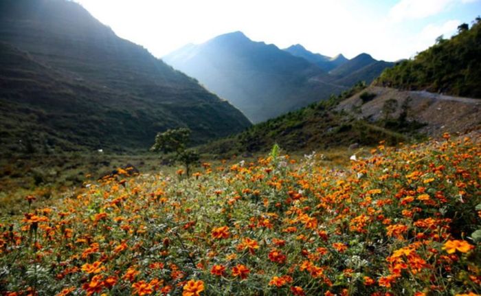 As you travel the winding roads of Ha Giang, you're bound to encounter these vibrant blooms, sometimes nestled in a small patch of flowers on the edge of a cliff overlooking the emerald Nho Que River, or resting with the morning dew along a stone fence of a quaint house. Each sight provides a warm, poetic atmosphere, one that is unlike any other region.