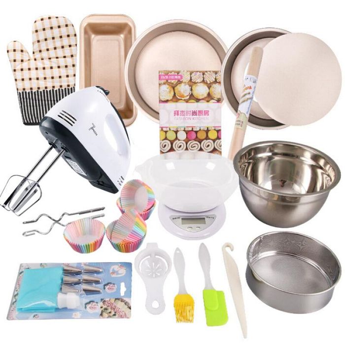 - Baking utensils: measuring cups, dough rollers, stainless steel egg beaters, wax paper, flour sifters, cake molds, cake boxes... and many other utensils.