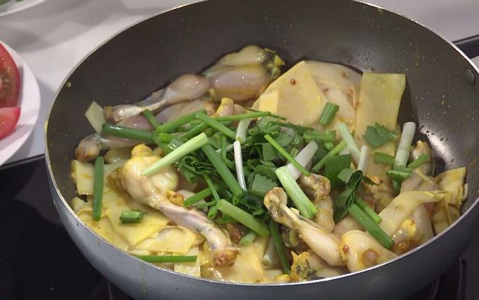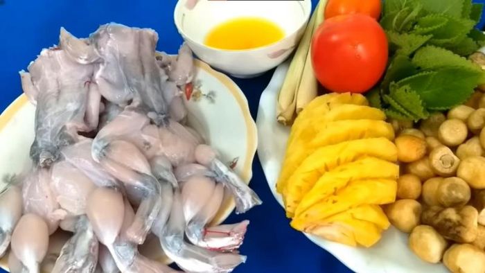 - Cut betel leaves, spring onions, and perilla leaves and sauté them with frog meat and bamboo shoots. In another pot, sauté crushed lemongrass with 1 tablespoon minced garlic. Add 1 tablespoon minced chili and 100g boiled pickled bamboo shoots to the sauté. Pour 1.5 liters of water into pot 1, season with 1 tablespoon seasoning powder, 1 teaspoon sugar, and add 100g shiitake mushrooms to cook.