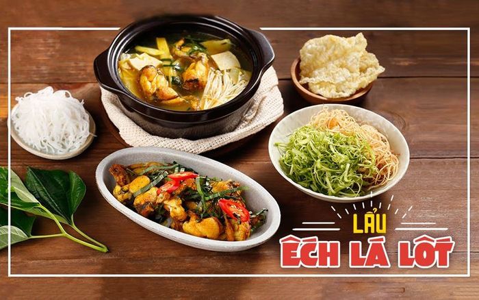 - The frog hot pot with river leaves has a delicious aroma, no fishy taste from the frog, a rich broth, and well-balanced seasoning. To enjoy, add vermicelli to a bowl, place the assorted vegetables in the hot pot, and wait for them to cook. Then, ladle the vegetables and frog meat into the bowl with the broth.