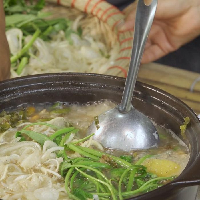 - When the broth is boiling, use a sieve to take out the soaked fermented rice and add it to the hot pot along with Vietnamese balm for aroma.