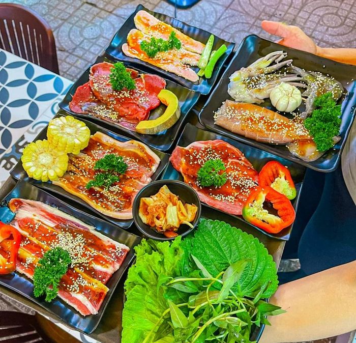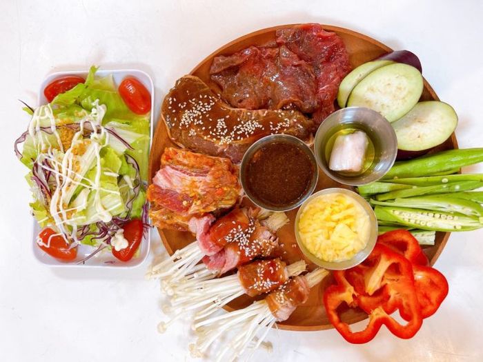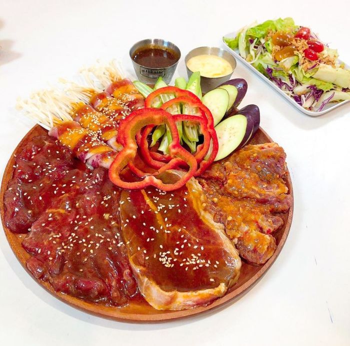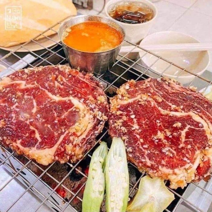 Grilled Beef Street is a well-established grilled beef chain in Ho Chi Minh City, known for its numerous branches. It has long been a favorite dining spot for many. As the trend of "grilled beef with salted egg sauce" took off, Grilled Beef Street quickly joined in, offering customers an exceptional dining experience. The grilled beef set with salted egg sauce includes thickly sliced beef marinated in a rich sesame sauce, cooked over a smokeless grill that keeps the meat tender and flavorful. The dish is served with a generous amount of salted egg sauce, perfect for dipping. Alongside, kimchi, fresh greens, and bread are included to complete the meal, ensuring fullness without being overwhelming.