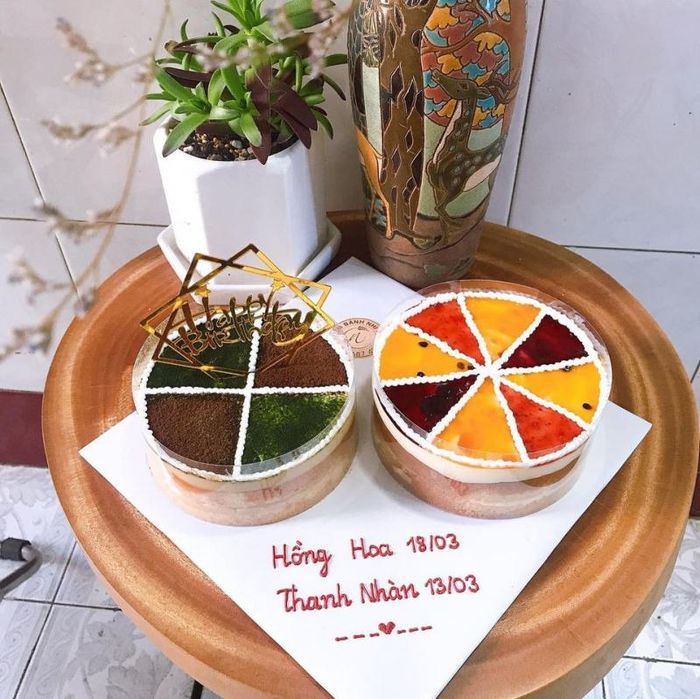 Nhi Nhi Bakery offers two popular Tiramisu flavors: cocoa and matcha. You can even order a combination of both flavors in one cake for a delightful experience. What sets their Tiramisu apart is the premium cocoa powder and matcha used, both sourced from reliable suppliers, enhancing the taste. The cocoa and matcha powder are evenly sprinkled over the cake, releasing a delightful fragrance that makes you eager to dig in. Additionally, when you order a cake from Nhi Nhi Bakery, you’ll receive a charming set of eco-friendly wooden utensils (spoon, fork, and knife) tied with a ribbon, along with a decorative twist candle to complete the experience.
